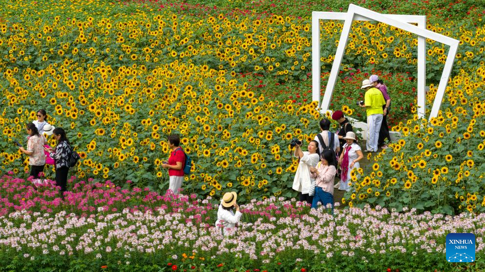 A drone photo shows tourists visiting a flower field in Kunshan City, east China's Jiangsu Province, Oct. 17, 2025. (Photo by Wang Xuzhong/Xinhua)