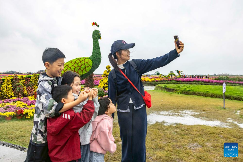 Tourists pose for photos at a scenic area in Xinghua, east China's Jiangsu Province, Oct. 18, 2025. (Photo by Tang Dehong/Xinhua)