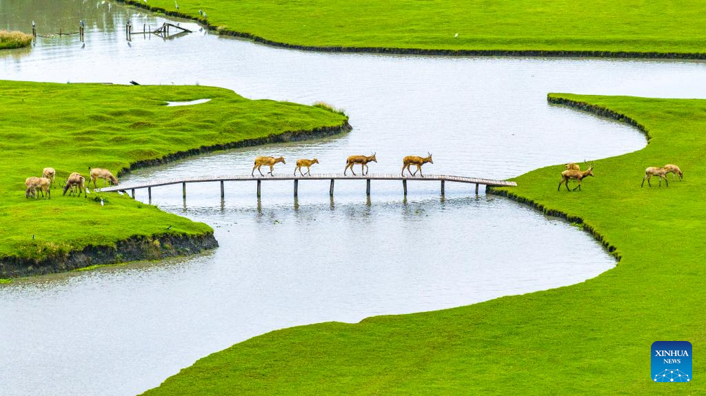 An aerial drone photo shows a group of milu deer crossing a river at a wetland park in Jiangyan District, Taizhou City, east China's Jiangsu Province, Oct. 17, 2025. (Photo by Zhou Shegen/Xinhua)