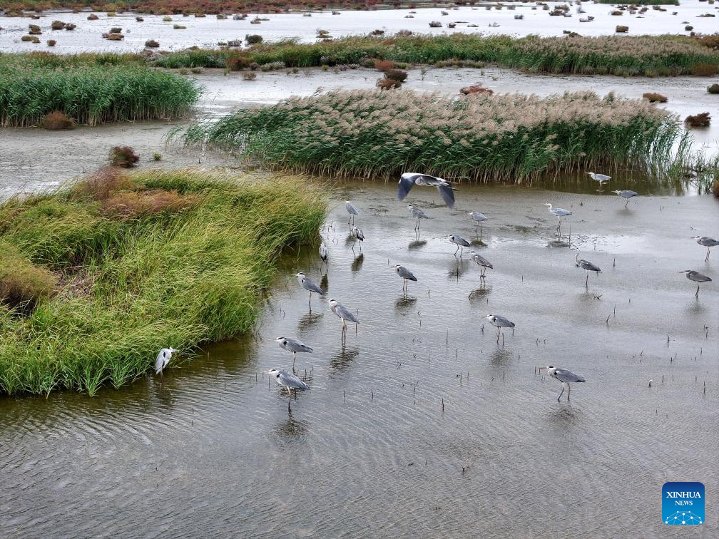 A drone photo shows a flock of migratory birds at Haizhou Bay National Marine Park in Lianyungang City, east China's Jiangsu Province, Oct. 18, 2025. (Photo by Wang Chun/Xinhua)
