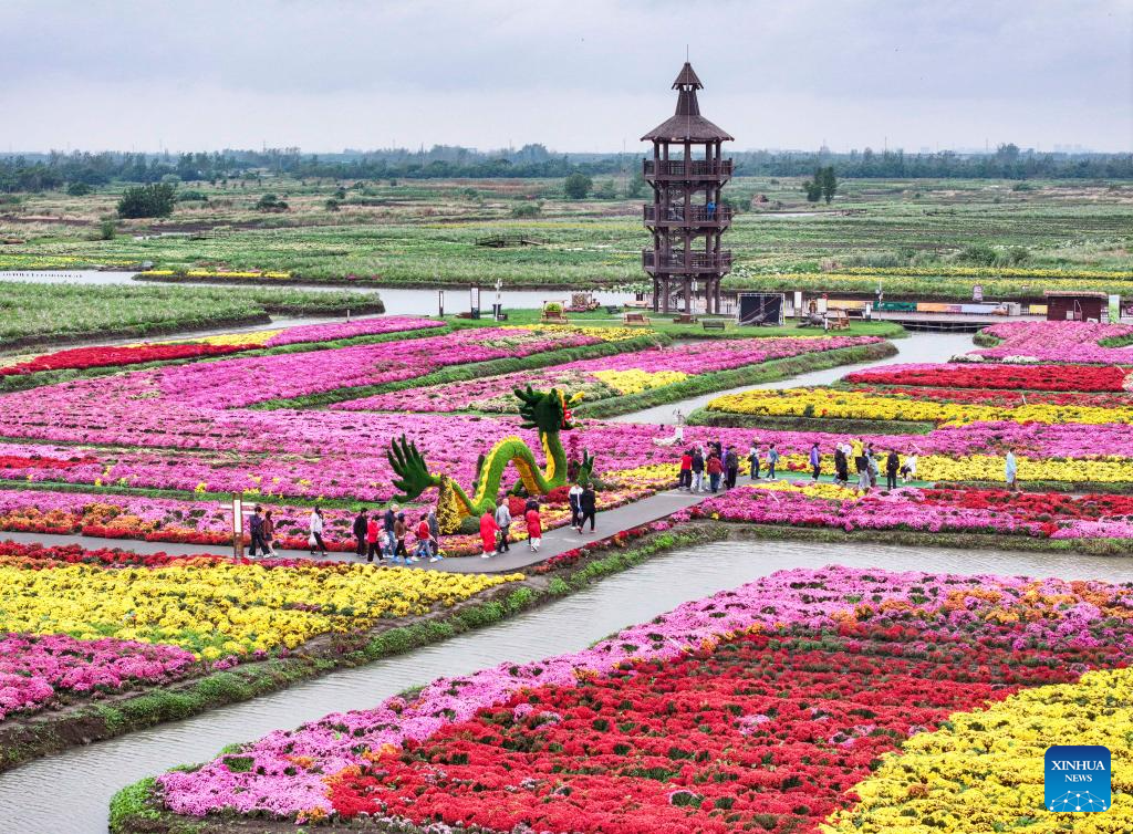 An aerial drone photo shows tourists visiting a scenic area in Xinghua, east China's Jiangsu Province, Oct. 18, 2025. (Photo by Gu Jihong/Xinhua)