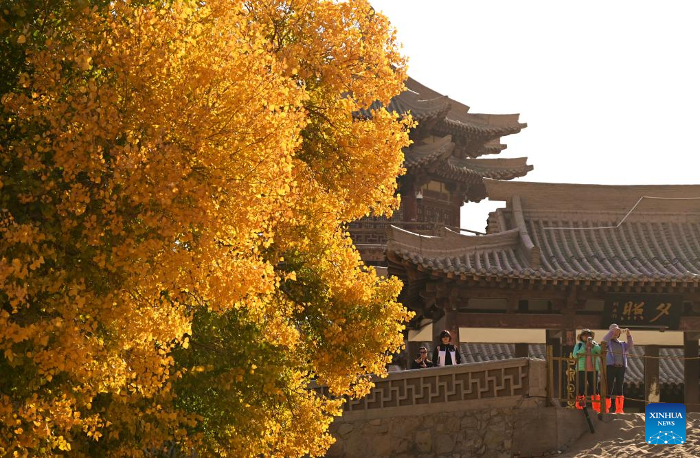 Tourists take photos near poplar trees at the Mingsha Mountain and Crescent Spring Scenic Area in Dunhuang City, northwest China's Gansu Province, Oct. 18, 2025. (Photo by Zhang Xiaoliang/Xinhua)