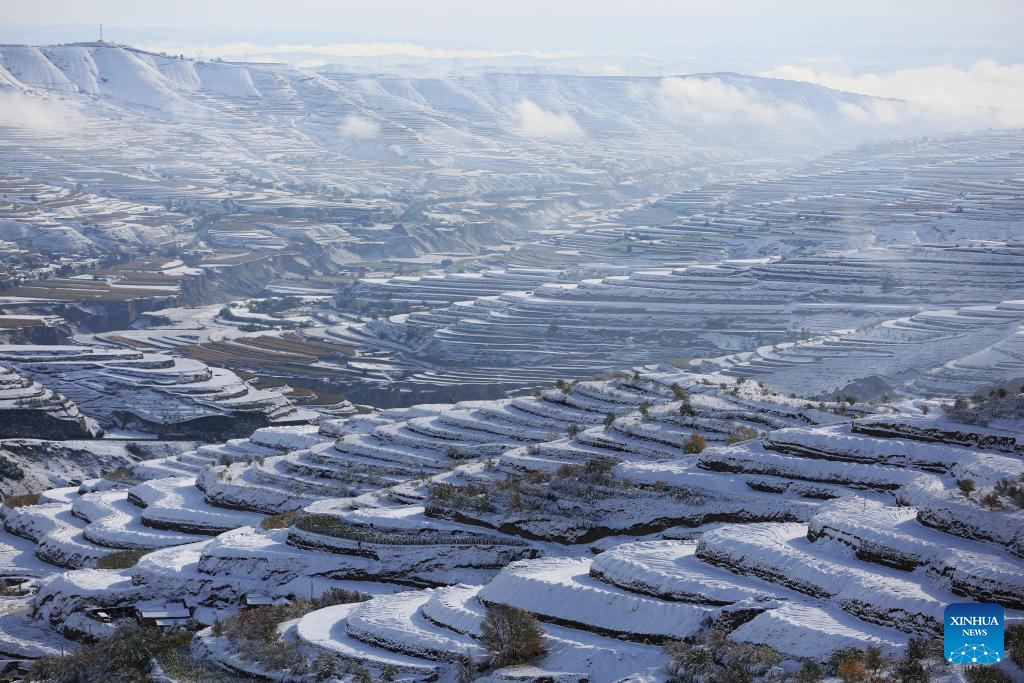 This photo taken on Oct. 17, 2025 shows snow snowy scenery in Qinglanshan Township, Anding District, Dingxi City, northwest China's Gansu Province. (Photo by Wang Kexian/Xinhua)