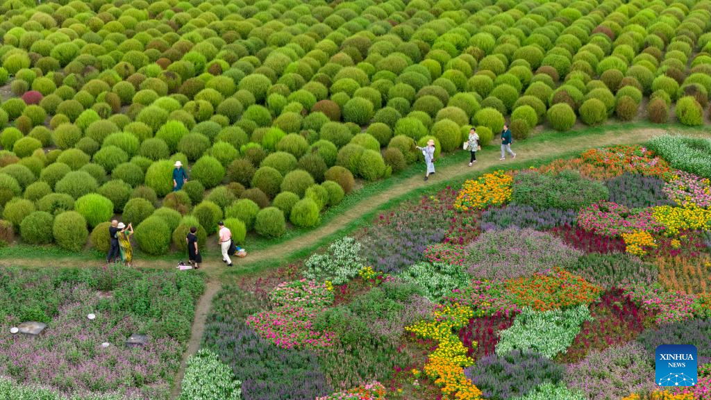 An aerial drone photo shows tourists having fun at a flower sea in Kunshan City, east China's Jiangsu Province, Oct. 17, 2025. (Photo by Wang Xuzhong/Xinhua)