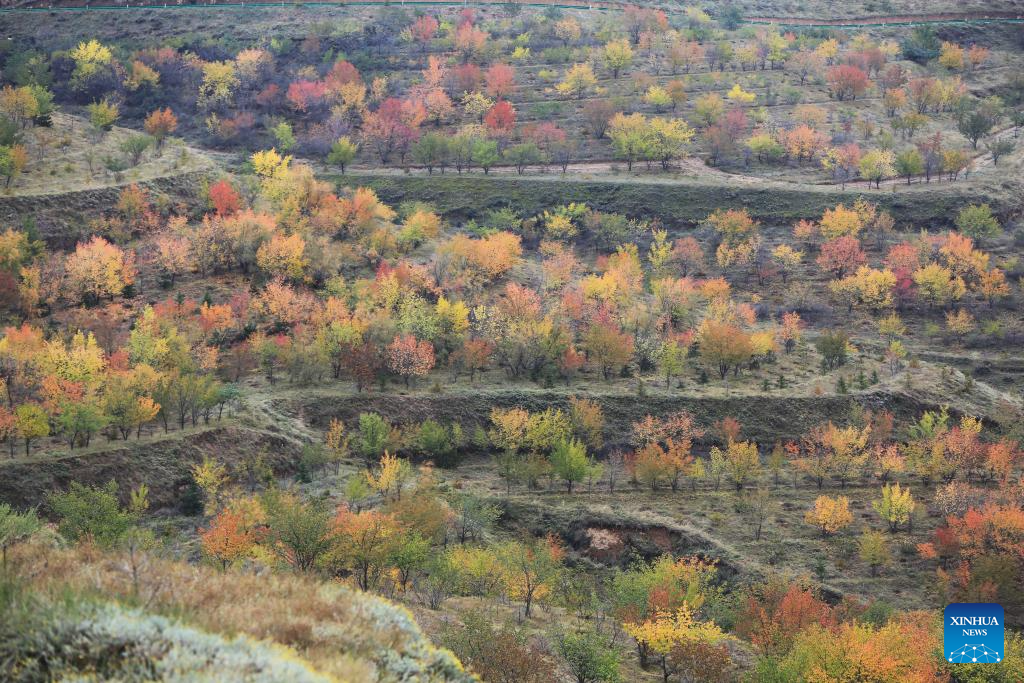 An aerial drone photo taken on Oct. 18, 2025 shows the autumn scenery of Fengxiang Town, Anding District, Dingxi City, northwest China's Gansu Province. (Photo by Wang Kexian/Xinhua)