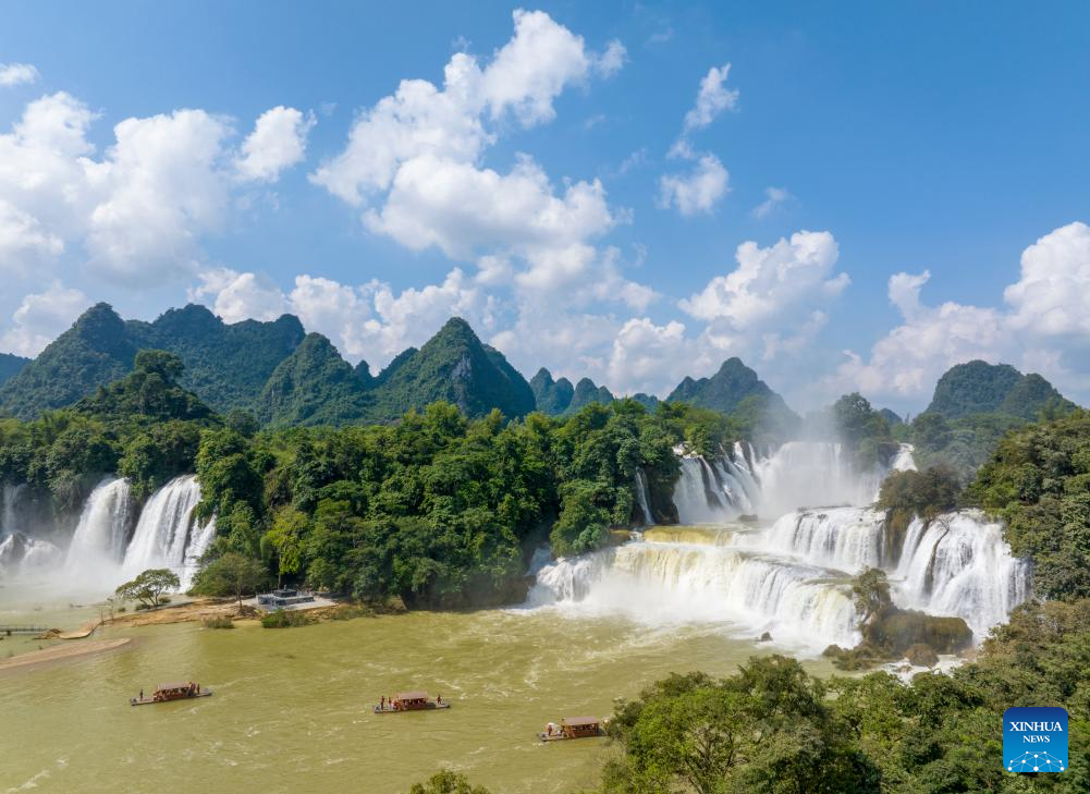 An aerial drone photo taken on Oct. 18, 2025 shows tourists taking a bamboo raft tour at Detian Waterfalls scenic area in Daxin County of Chongzuo City, south China's Guangxi Zhuang Autonomous Region. People are heading outdoors to enjoy the pleasant autumn days across China. (Photo by Long Tao/Xinhua)