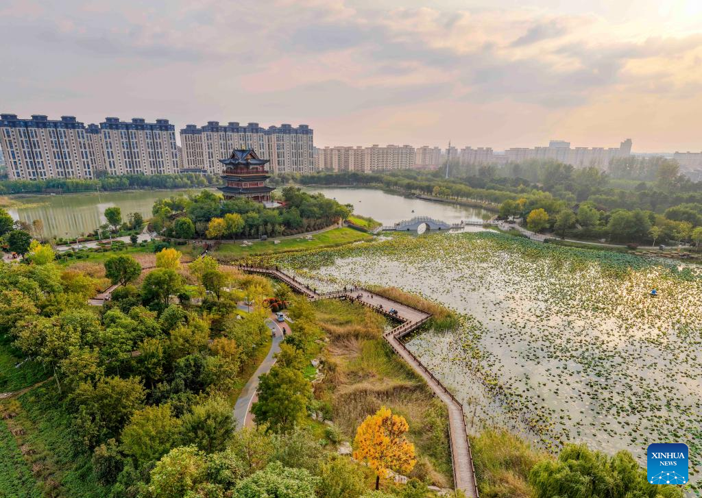 An aerial drone photo taken on Oct. 18, 2025 shows people visiting a scenic area in Suixian County of Shangqiu City, central China's Henan Province. People are heading outdoors to enjoy the pleasant autumn days across China. (Photo by Xu Zeyuan/Xinhua)