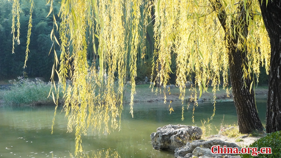 Weeping willows bathed in sunlight at Zizhuyuan Park in Haidian district, Beijing, Nov. 3, 2025. [Photo by ZhangYuxin/China.org.cn]
