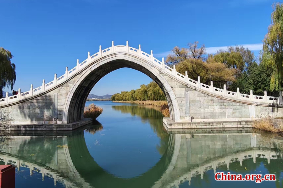 A photo taken on Nov. 10, 2025 shows the Summer Palace in Beijing featuring one of the several iconic bridges across Kunming Lake. The Seventeen-Arch Bridge (Shiqi Kong Qiao) is the most famous on the eastern side, and the Jade Belt Bridge (Yudai Qiao) on the western shore. These are popular viewing spots that offer a vantage point for photos, especially at sunrise or sunset when the arches are often reflected in the lake, with the mountains visible in the distance. [Photo by Lin Liyao/China.org.cn]