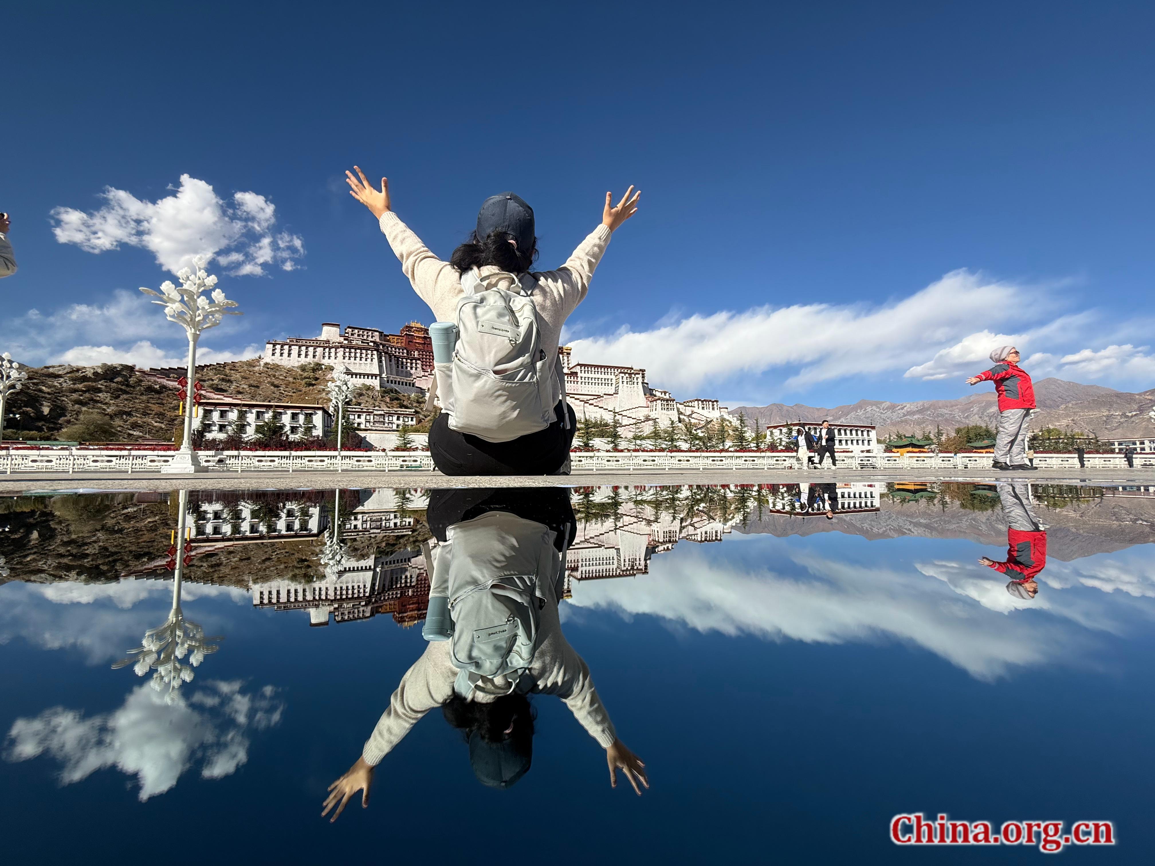 Visitors pose for photos with the reflection of the Potala Palace on Potala Palace Square, Lhasa, southwest China's Xizang autonomous region, Oct. 21, 2025. "Stone mirrors" engraved on the ground help tourists capture reflections of the palace. [Photo by Li Congrong/China.org.cn]