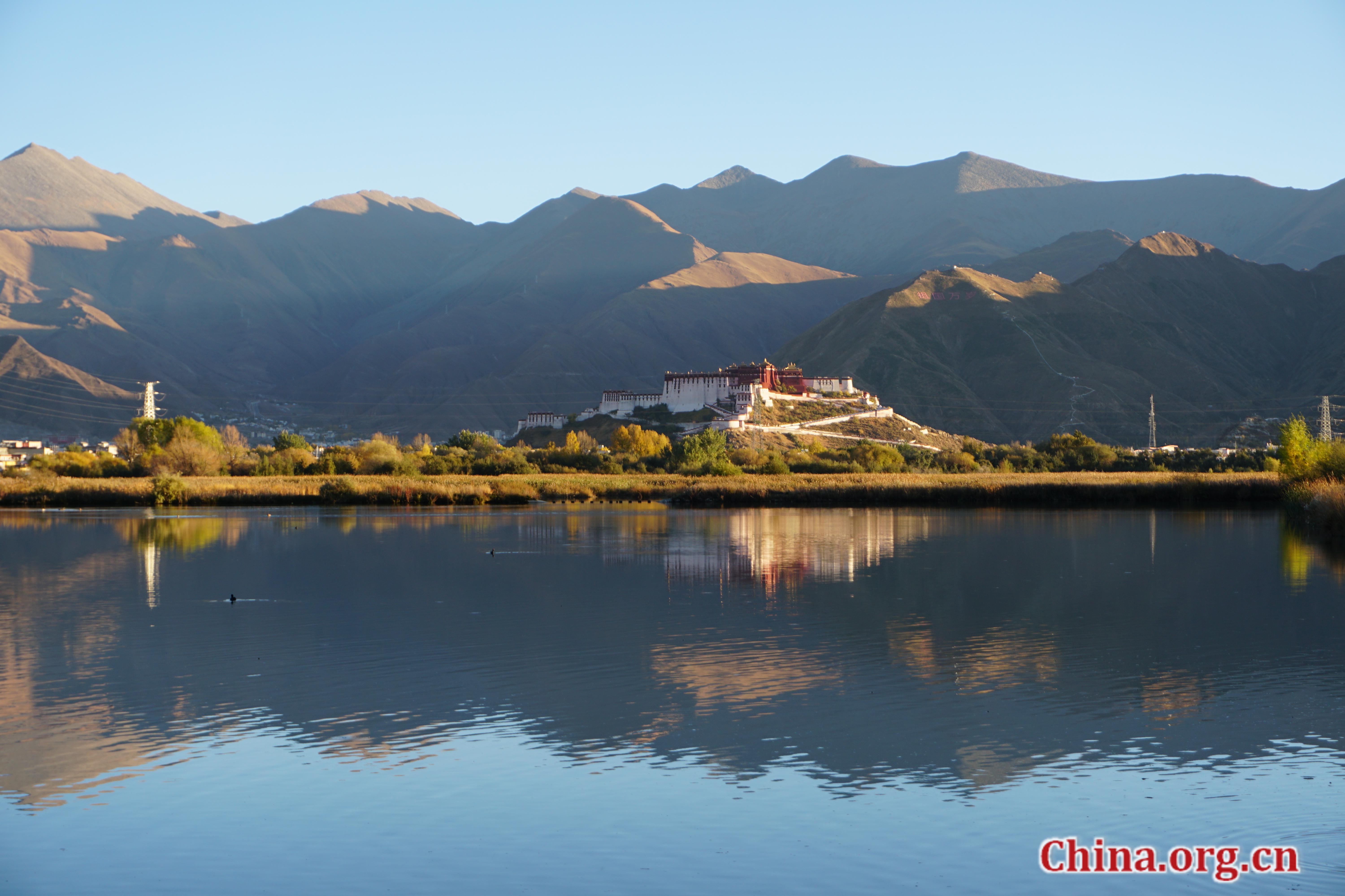 The Potala Palace is reflected in a lake at Lhalu Wetland National Nature Reserve, Lhasa, southwest China's Xizang autonomous region, Oct. 21, 2025. At sunset, one side of the palace falls into shadow while the other remains bathed in golden light. [Photo by Li Congrong/China.org.cn]
