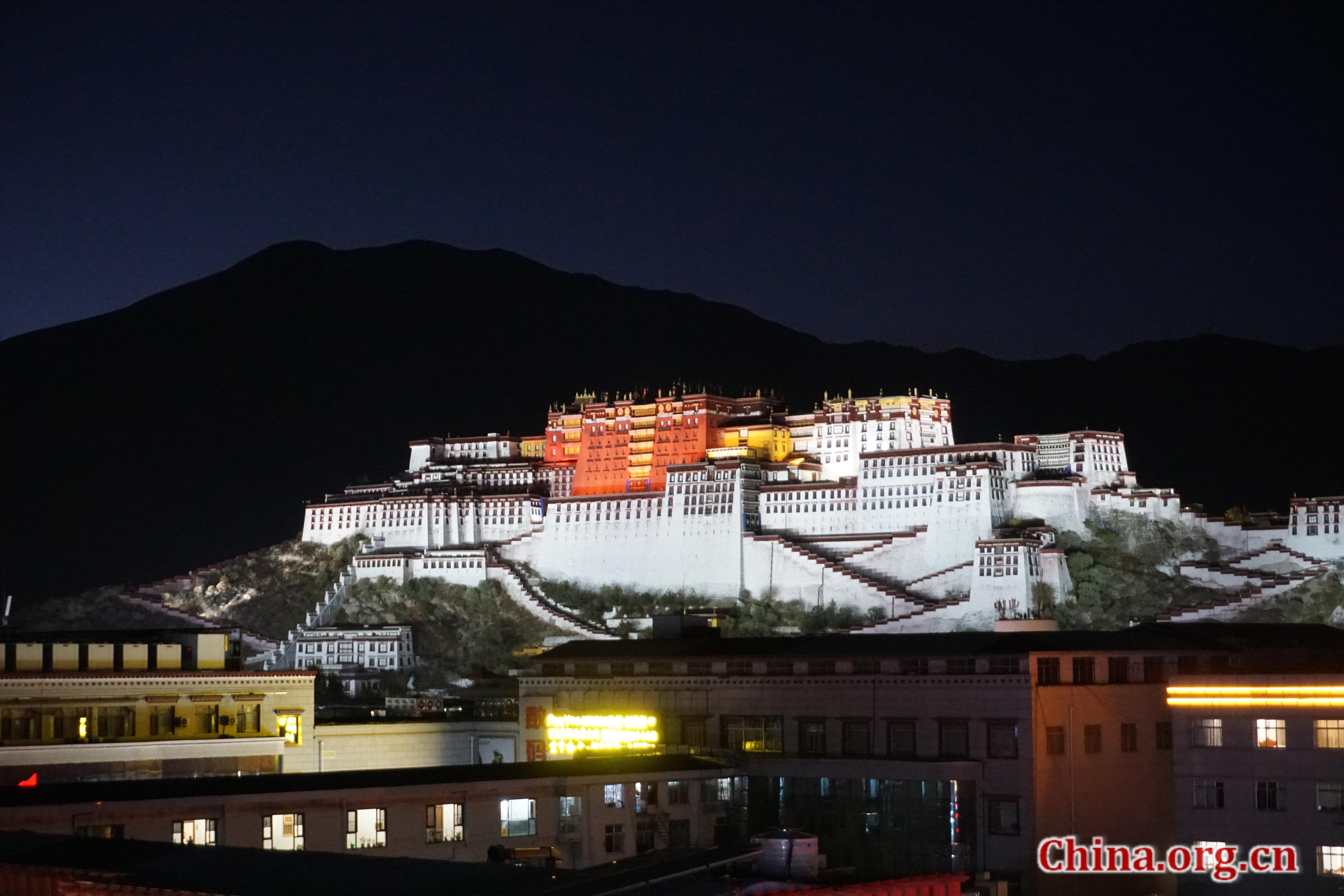 The illuminated Potala Palace glows above Lhasa as seen from a terrace restaurant on Yutuo Road, southwest China's Xizang autonomous region, Oct. 21, 2025. [Photo by Li Congrong/China.org.cn]