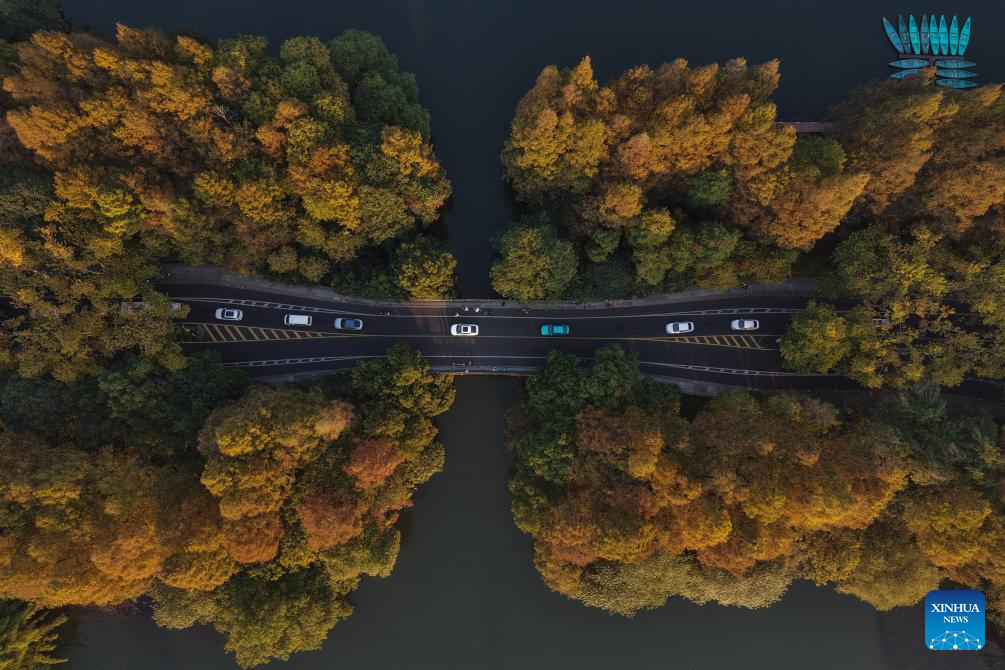 An aerial drone photo shows a view of the West Lake scenic area in Hangzhou, east China's Zhejiang province, Nov. 21, 2025. [Photo/Xinhua]