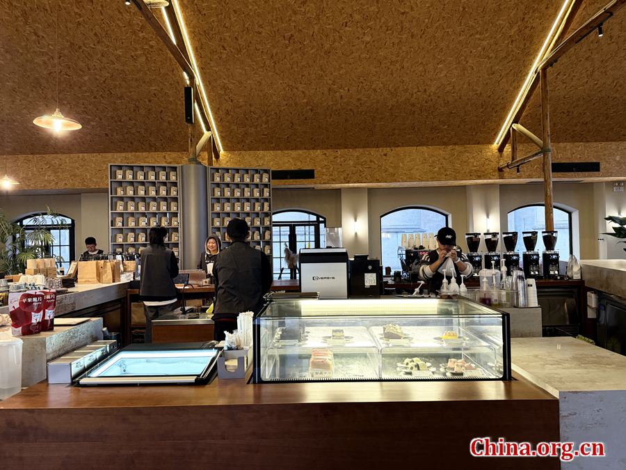 Staff make coffee at a cafe at Shendang Granary Cultural Industry Park, Shendang town, Haiyan county, Jiaxing, east China's Zhejiang province, Dec. 4, 2025. [Photo by Chen Xinyan/China.org.cn]