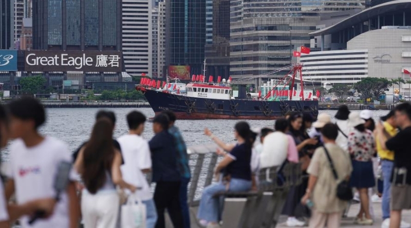 Tourists take photos of cruising fishing vessels on the Tsim Sha Tsui waterfront in Hong Kong, July 1, 2025. [Photo/Xinhua]