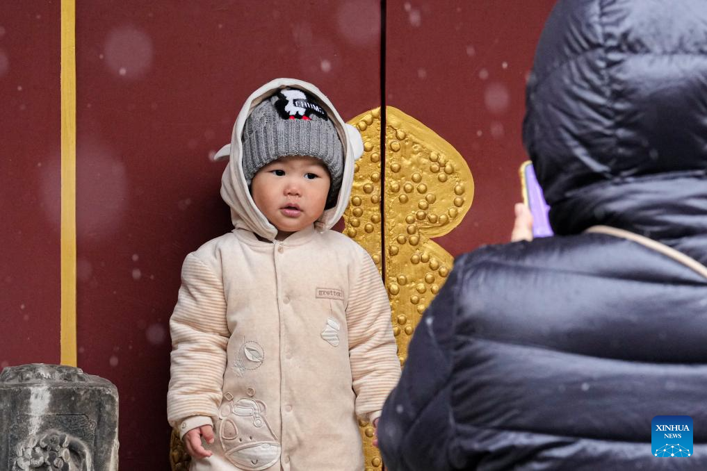 A child poses for a photo amid snowfall in Beijing, capital of China, Dec. 12, 2025. Beijing witnessed its first significant snowfall of this winter season on Friday. (Xinhua/Bi Xiaoyang)