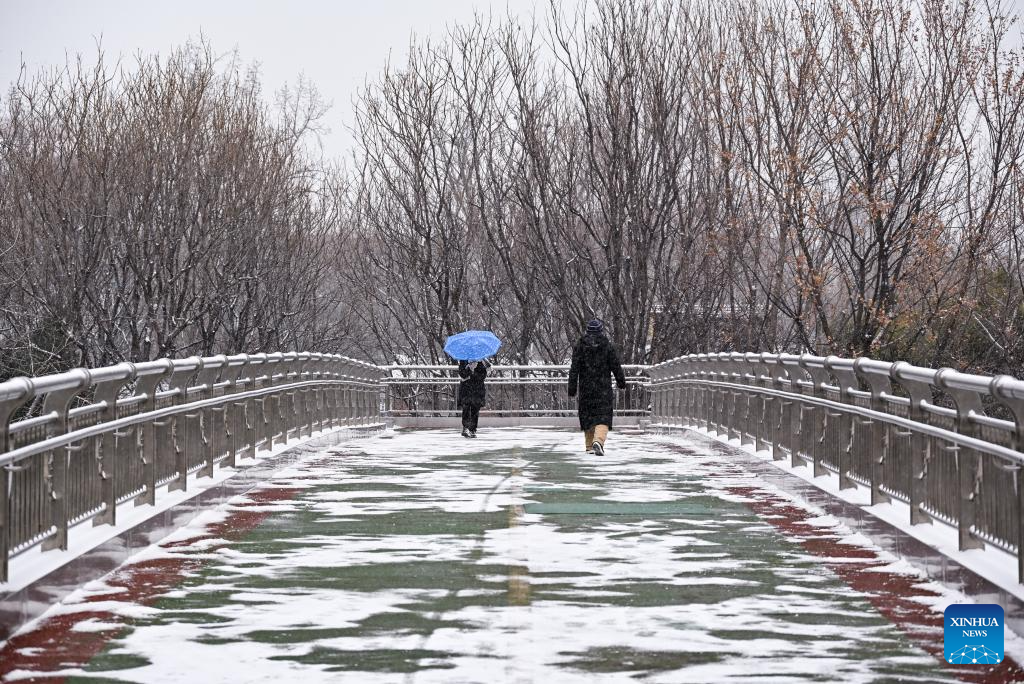 Pedestrians walk on an overpass amid snowfall in Beijing, capital of China, Dec. 12, 2025. Beijing witnessed its first significant snowfall of this winter season on Friday. (Xinhua/Xu Qin)