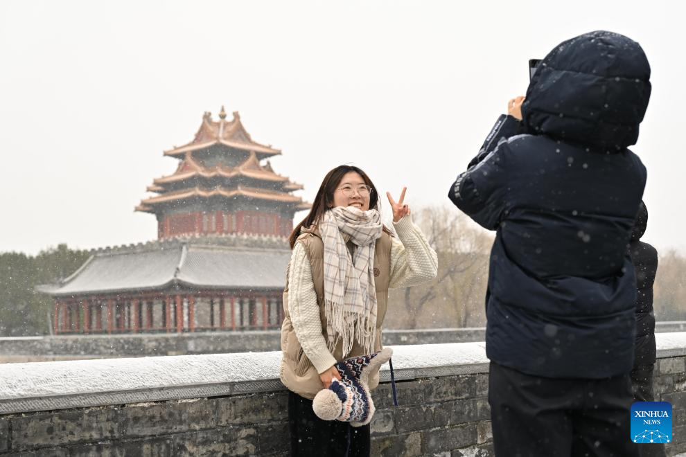 A tourist poses for photos amid snowfall near a turrent of the Palace Museum in Beijing, China, Dec. 12, 2025. Beijing witnessed its first significant snowfall of this winter season on Friday. (Xinhua/Li Xin)