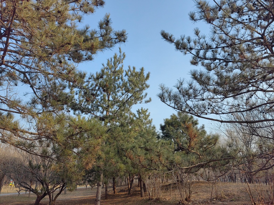Some trees remain green at Nanyuan Forest Wetland Park in Beijing, Dec. 11, 2025. [Photo by Liu Sitong/China.org.cn]