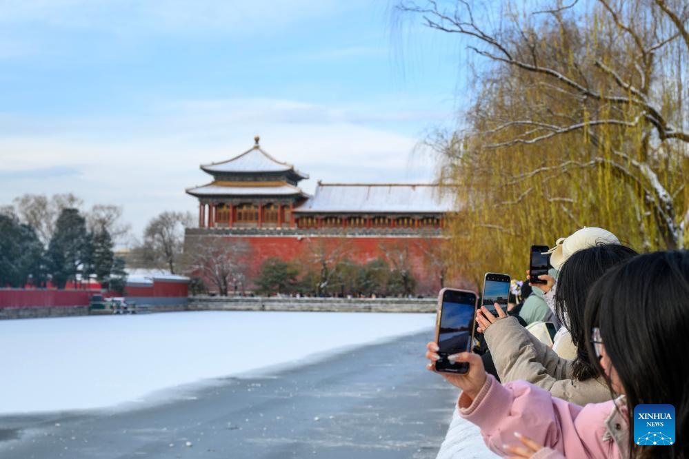 Tourists take photos near the Palace Museum after snowfall in Beijing, capital of China, Dec. 13, 2025. (Xinhua/Jin Liangkuai)