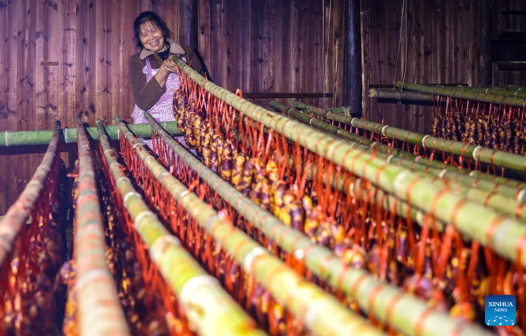 A villager makes sausages in Dawan village, Tongren city of southwest China's Guizhou province, Dec. 15, 2025. [Photo/Xinhua]