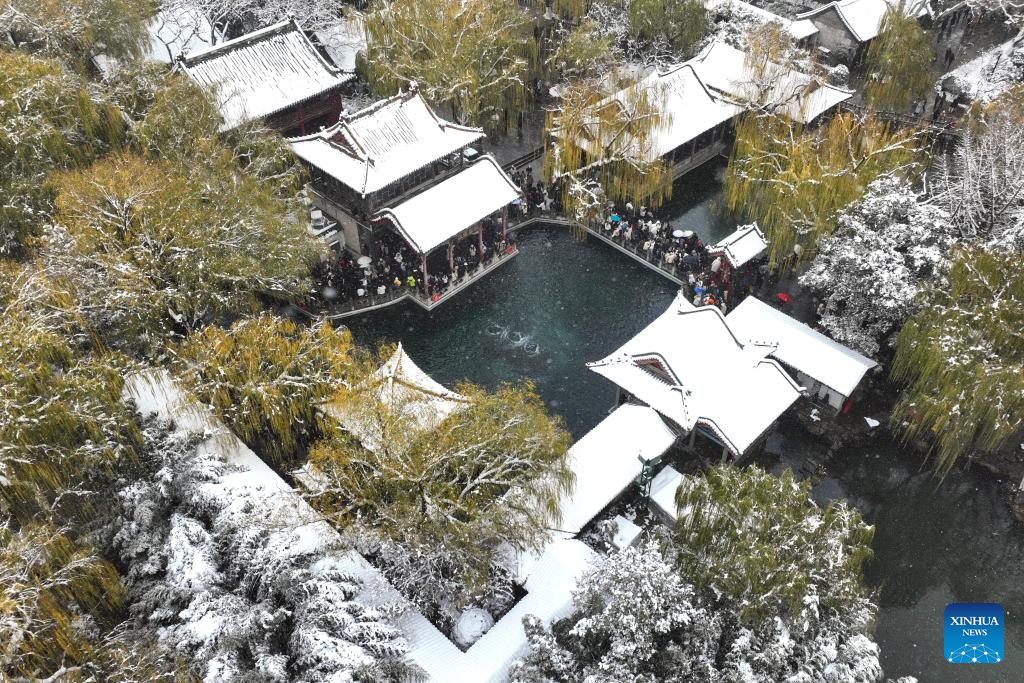 A drone photo taken on Dec. 13, 2025 shows people enjoying snowy scenery at Baotu Spring Park in Jinan, east China's Shandong province. [Photo/Xinhua]