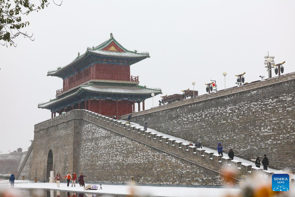 Tourists visit the south gate of the Zhengding ancient city in snowfall in Shijiazhuang city, north China's Hebei province, Dec. 12, 2025. [Photo/Xinhua]