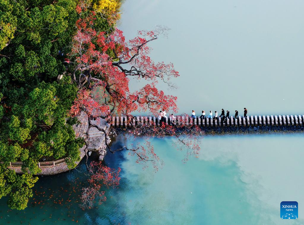 A drone photo taken on Nov. 30, 2025 shows tourists visiting a cultural park in Taishun county, Wenzhou city of east China's Zhejiang province. [Photo/Xinhua]
