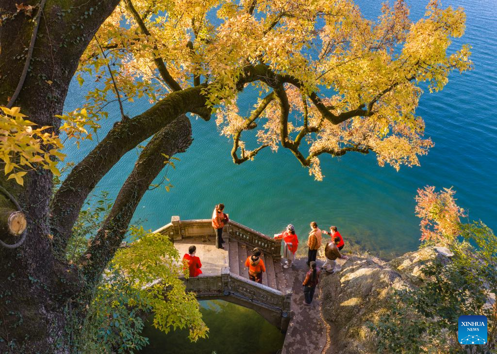 An aerial drone photo taken on Nov. 23, 2025 shows tourists enjoying sightseeing on an arch bridge near Wenchang pavilion in Ningbo city, east China's Zhejiang province. [Photo/Xinhua]