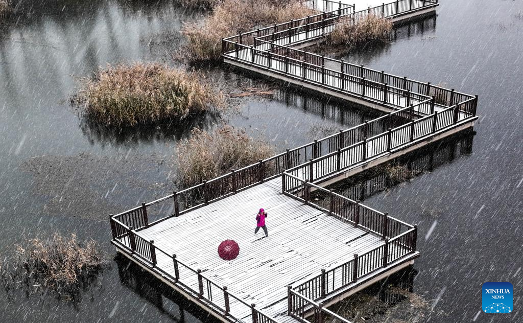 A drone photo taken on Dec. 12, 2025 shows a tourist enjoying the snowfall on the Quyang Lake in Jiyuan, central China's Henan province. [Photo/Xinhua]
