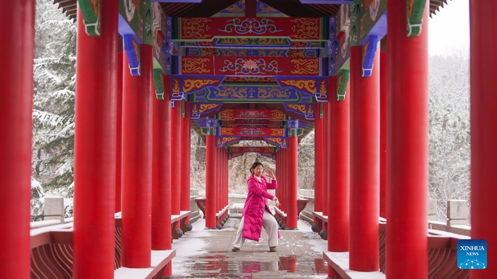 A Tai Chi enthusiast exercises at a corridor of Yinghua mountain scenic spot in Zouping city, east China's Shandong province, Dec. 13, 2025. [Photo/Xinhua]