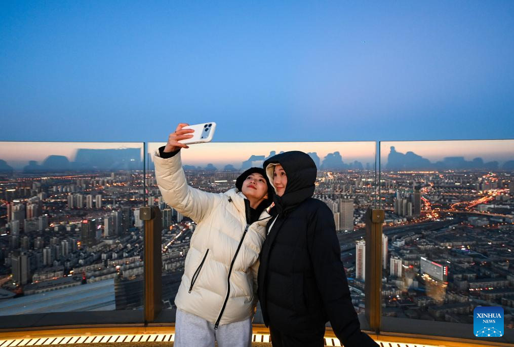 Visitors pose for a selfie at the Jinwan Yunding sightseeing deck in Heping District of Tianjin, north China on Dec. 20, 2025. Recently, the Jinwan Yunding sightseeing deck, located at the Jinwan Plaza in Heping District of Tianjin, has begun operation. Visitors can ascend to the 300-meter-high rooftop to overlook Tianjin's urban view. (Xinhua/Zhao Zishuo)