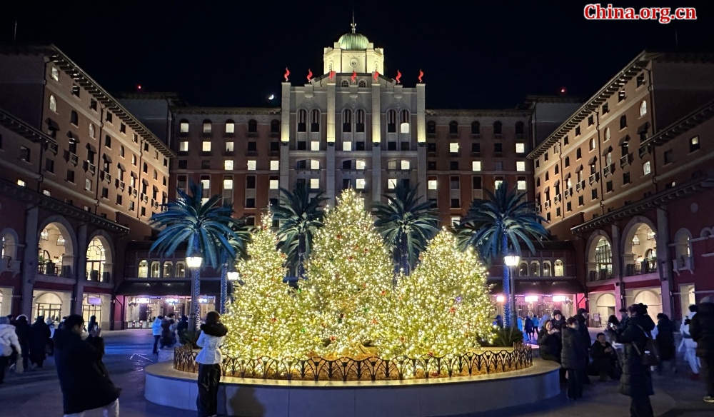 Holiday lights glow at Universal Beijing Resort, Dec. 24, 2025. [Photo by Yan Xiaoqing/China.org.cn]