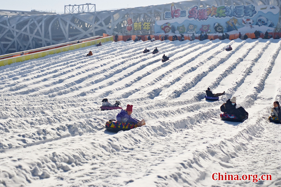 Visitors ride the snow tubing slide at the snow drifting zone during the 15th Bird's Nest Happy Ice and Snow Season in Beijing on Dec. 27, 2025. [Photo by Gong Yingchun/China.org.cn]
