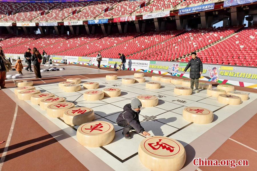 A child plays on a giant Chinese chess board in the National Stadium during the 15th Bird's Nest Happy Ice and Snow Season in Beijing, Dec. 27, 2025. [Photo by Gong Yingchun/China.org.cn]