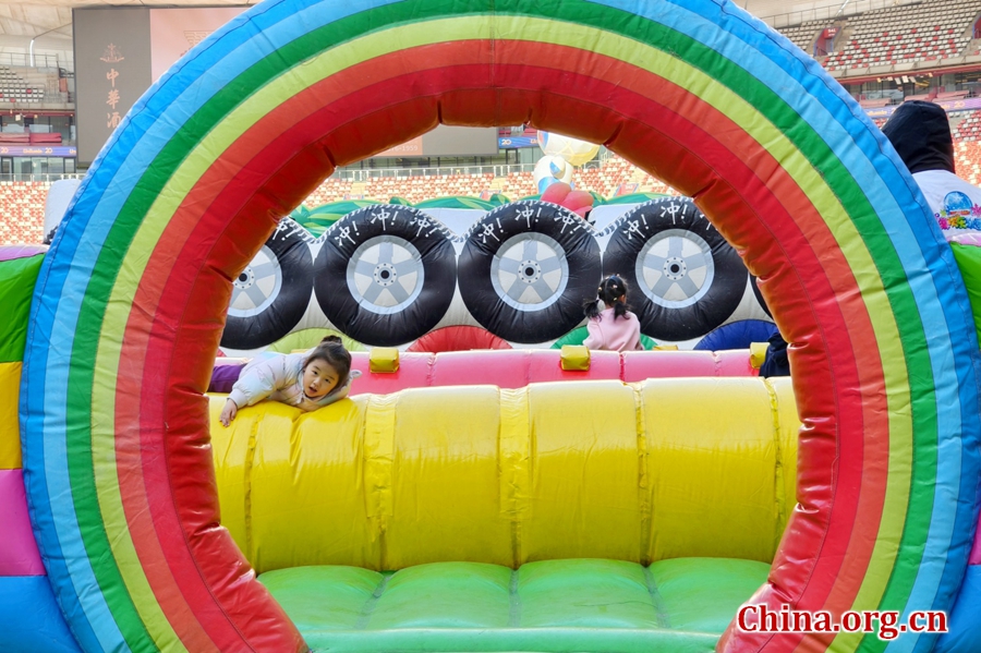 Children bounce through an inflatable park in the National Stadium during the 15th Bird's Nest Happy Ice and Snow Season in Beijing, Dec. 27, 2025. [Photo by Gong Yingchun/China.org.cn]