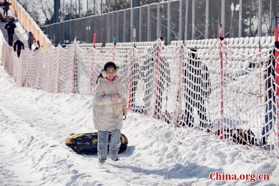 A girl drags her snow tube after riding the slide at the snow drifting zone during the 15th Bird's Nest Happy Ice and Snow Season in Beijing, Dec. 27, 2025. [Photo by Gong Yingchun/China.org.cn]