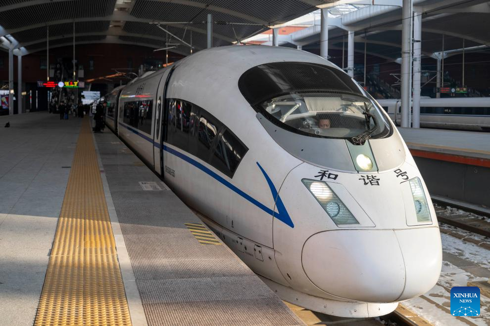 The bullet train No.G1276, the first themed high-speed train of the Harbin Ice-Snow World, is pictured at Harbin West Station in Harbin, northeast China's Heilongjiang Province, Jan. 4, 2026. (Xinhua/Zhang Tao)