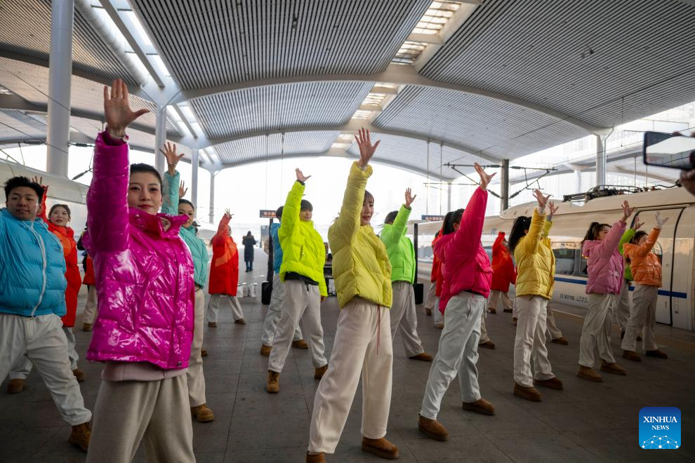 Performers dance outside the bullet train No.G1276, the first themed high-speed train of the Harbin Ice-Snow World, at Harbin West Station in Harbin, northeast China's Heilongjiang Province, Jan. 4, 2026. (Xinhua/Zhang Tao)