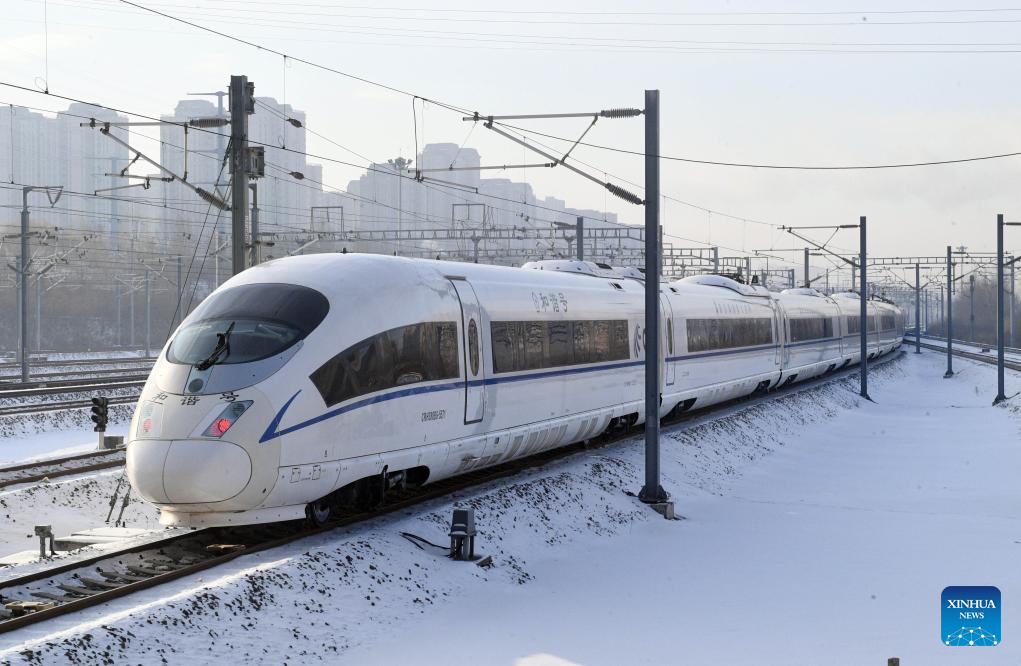 The bullet train No.G1276, the first themed high-speed train of the Harbin Ice-Snow World, departs from Harbin West Station in Harbin, northeast China's Heilongjiang Province, Jan. 4, 2026. (Photo by Liu Yang/Xinhua)
