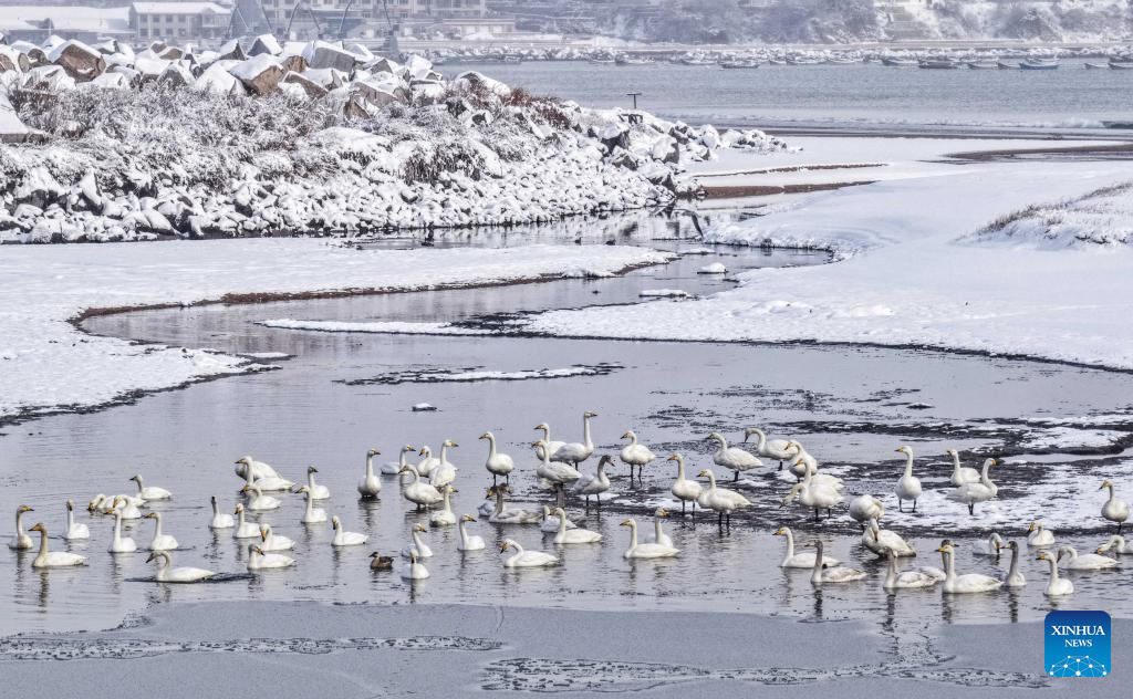 Whooper swans rest in Rongcheng, east China's Shandong province, Jan. 11, 2026. (Photo by Li Xinjun/Xinhua)