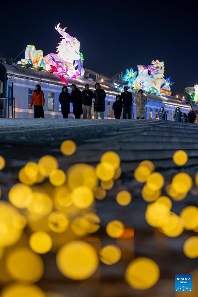 A drone photo taken on Dec. 31, 2025 shows people attending an ice and snow festival in Hohhot, north China's Inner Mongolia Autonomous Region. Hohhot has launched more than 300 winter amusement programs since December 2025, incorporating ice and snow sports, cultural experiences and vogue consumption to boost the local economy. (Xinhua/Lian Zhen)