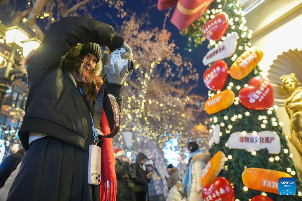 A woman takes photos on the Central Street in Harbin, northeast China's Heilongjiang Province, Jan. 8, 2026. As one of the most popular attractions in Harbin, the Central Street, which is renowned for its diverse European-style architecture, wows tourists with its colorful lights at night during the city's tourism boom this winter. (Xinhua/Wang Jianwei)