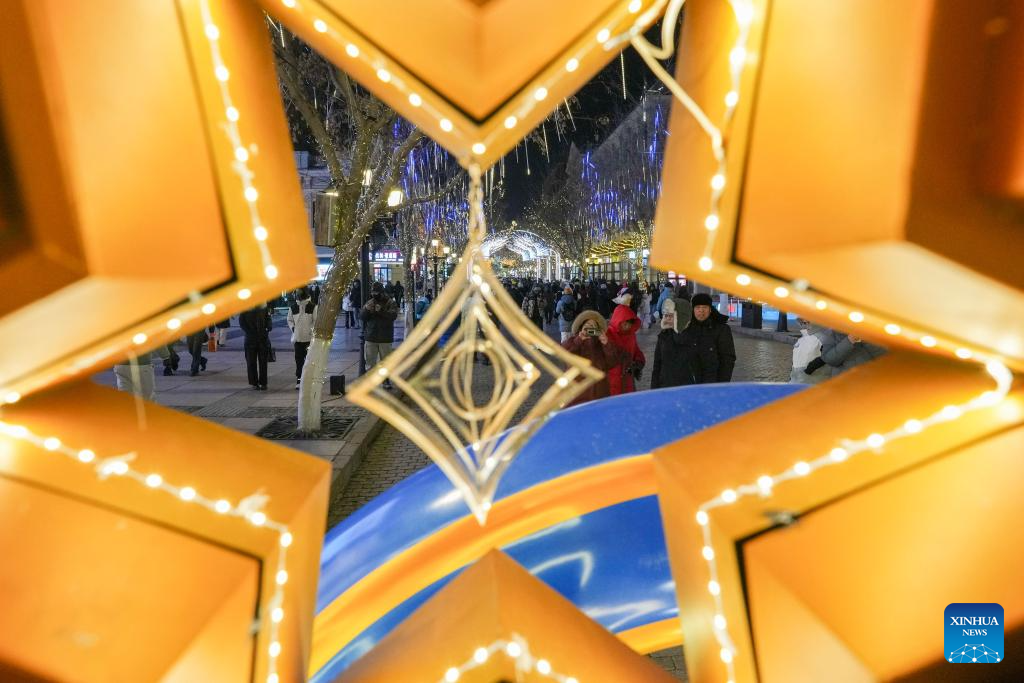 People take photos on the Central Street in Harbin, northeast China's Heilongjiang Province, Jan. 11, 2026. As one of the most popular attractions in Harbin, the Central Street, which is renowned for its diverse European-style architecture, wows tourists with its colorful lights at night during the city's tourism boom this winter. (Xinhua/Wang Jianwei)