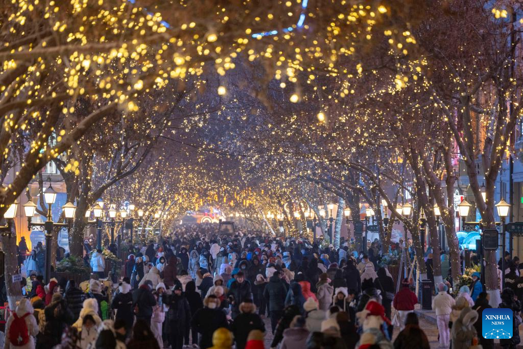 People visit the Central Street in Harbin, northeast China's Heilongjiang Province, Jan. 12, 2026. As one of the most popular attractions in Harbin, the Central Street, which is renowned for its diverse European-style architecture, wows tourists with its colorful lights at night during the city's tourism boom this winter. (Xinhua/Zhang Tao)