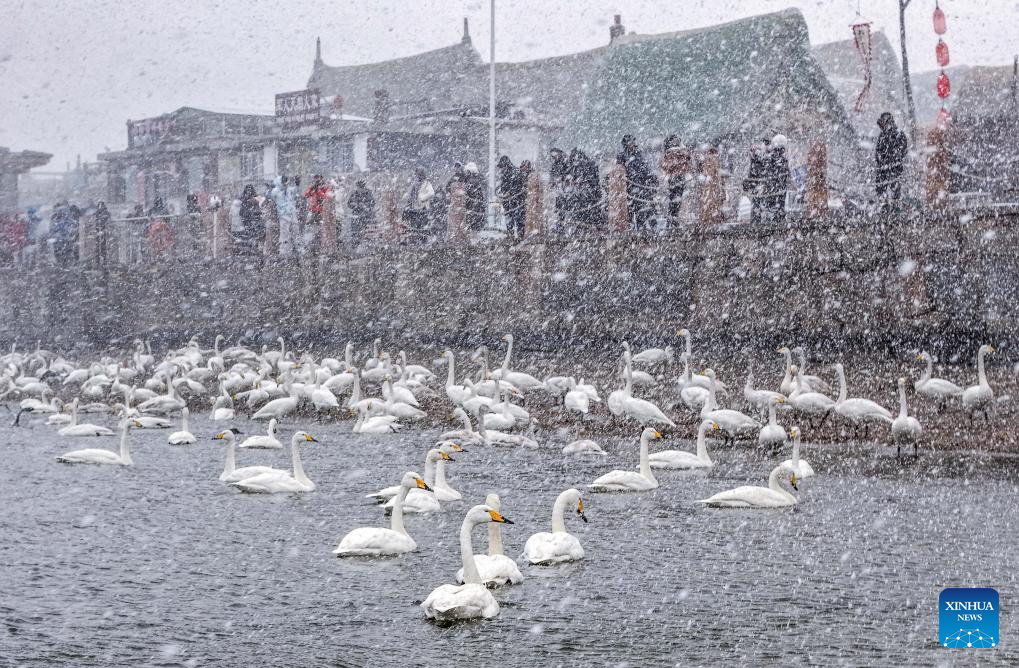 A drone photo taken on Jan. 10, 2026 shows visitors watching whooper swans in snowfall in Yandunjiao Village, Rongcheng City of east China's Shandong Province.
