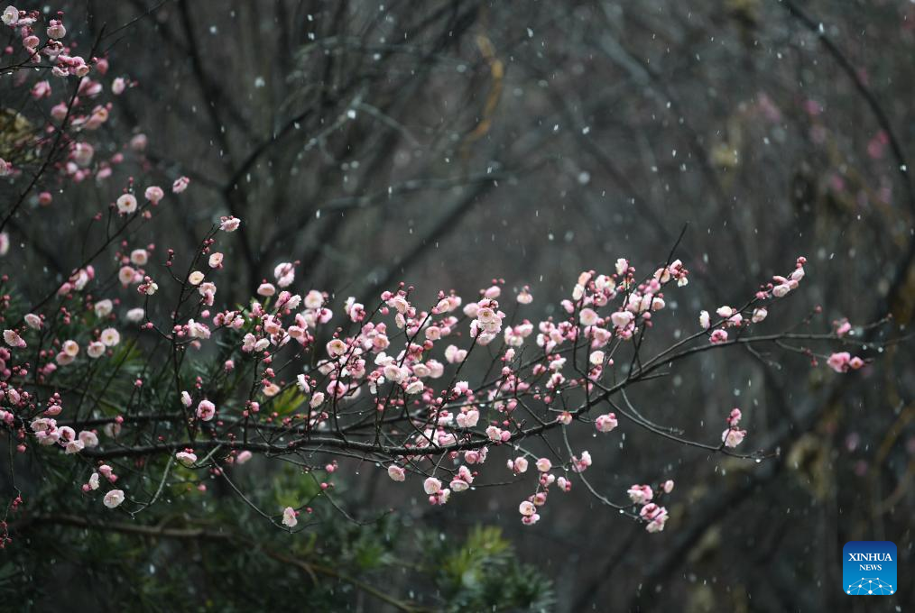 This photo taken on Dec. 31, 2025 shows plum flowers in snowfall at a park in Xiangyang City, central China's Hubei Province.