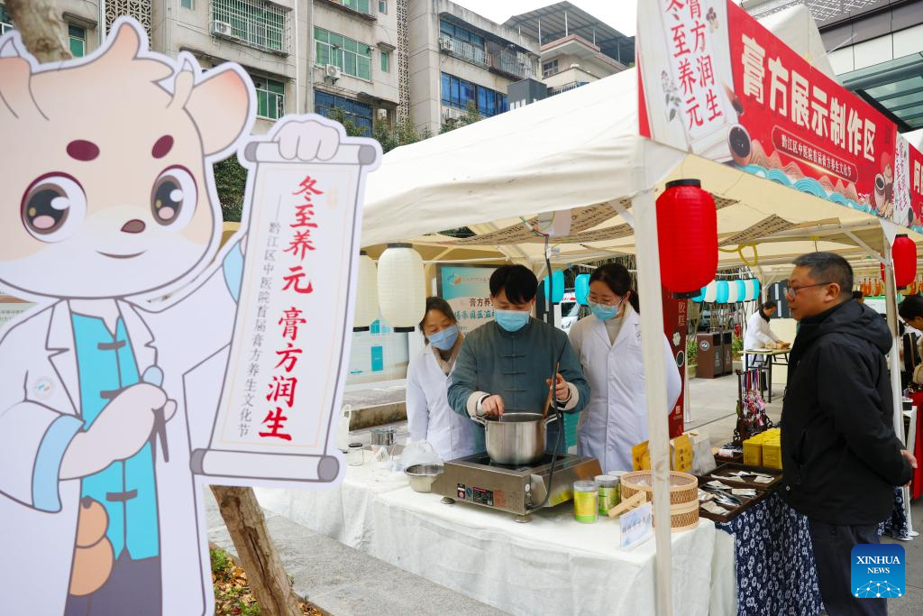 This photo taken on Dec. 21, 2025 shows medical staff making ointment for Winter Solstice during a fair in Chongqing, southwest China.