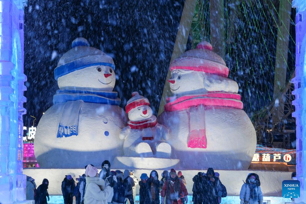 Tourists take photos near giant snowmen at the Harbin Ice-Snow World in Harbin, northeast China's Heilongjiang Province, Jan. 13, 2026. With the arrival of the ice and snow season, various public facilities in Heilongjiang Province have created distinctive snowman-themed landscapes to attract locals and tourists. [Photo/Xinhua]