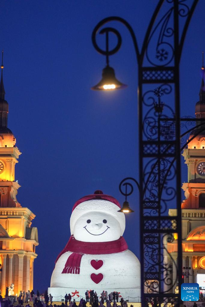 Tourists take photos of the iconic giant snowman at the Qunli music park in Harbin, northeast China's Heilongjiang Province, Jan. 10, 2026. With the arrival of the ice and snow season, various public facilities in Heilongjiang Province have created distinctive snowman-themed landscapes to attract locals and tourists. [Photo/Xinhua]